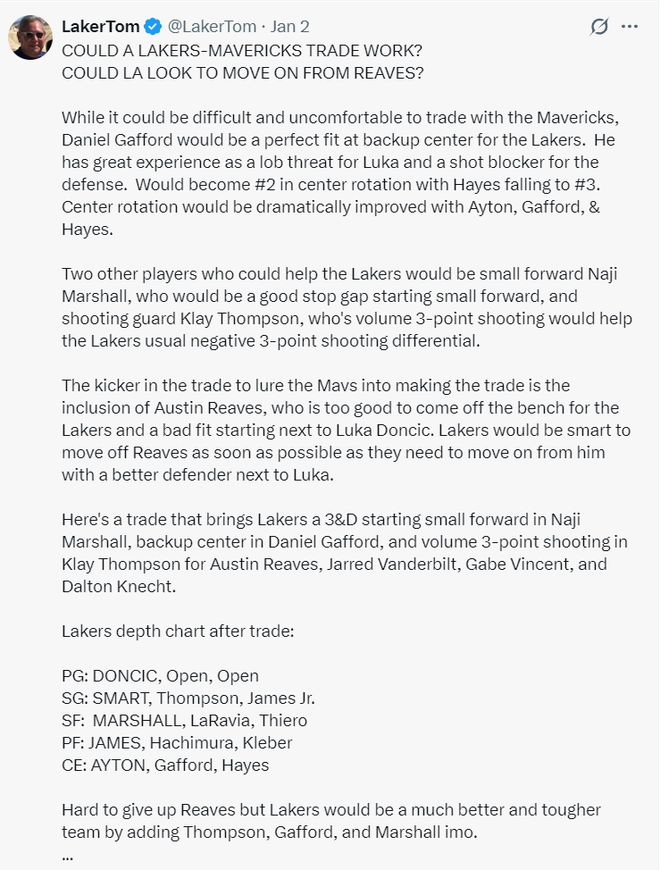1月1日時CBS記者薩姆-奎因這樣建議:放棄這個賽季吧,休賽期手握5500萬的薪金空間,用這筆錢來補強防守與運動能力,然后還可以評估交易市場,今夏湖人有三個可以交易的首輪簽足夠打包換來一個球星,或者拆分增加陣容深度,重點是彌補東契奇防守端的不足。
