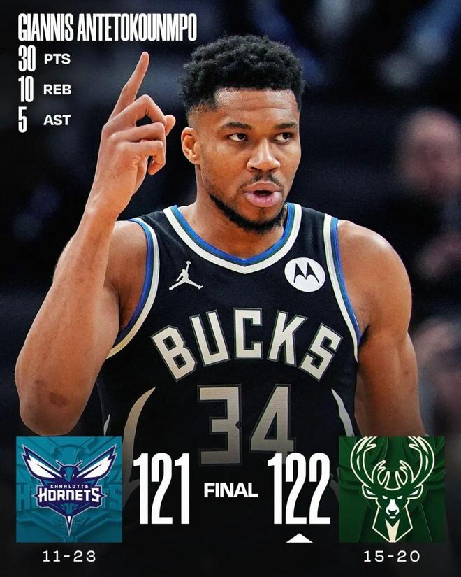 常規賽,雄鹿主場122-121戰勝黃蜂。