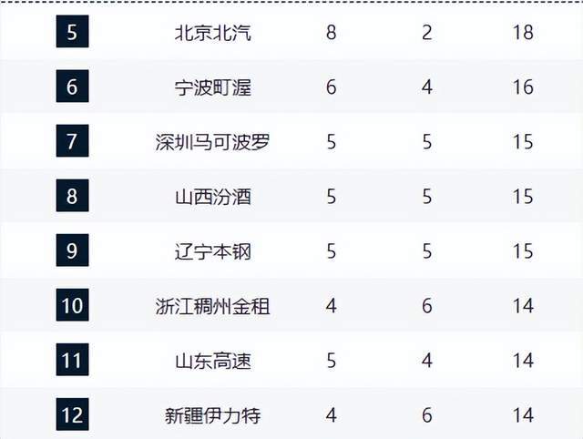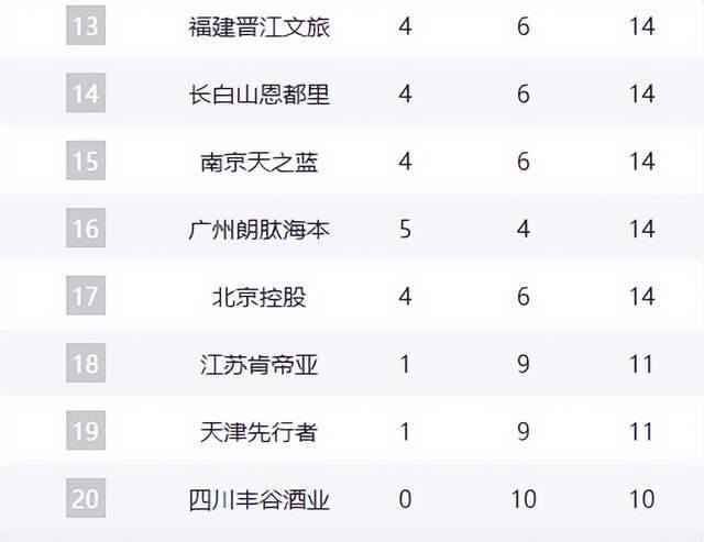 江蘇、天津、四川三隊固定于積分榜末端。江蘇隊進攻乏力,天津隊防守漏洞百出,四川隊則缺乏競爭力。三隊均需在后續比賽中尋求突破,以避免提前鎖定保級席位。