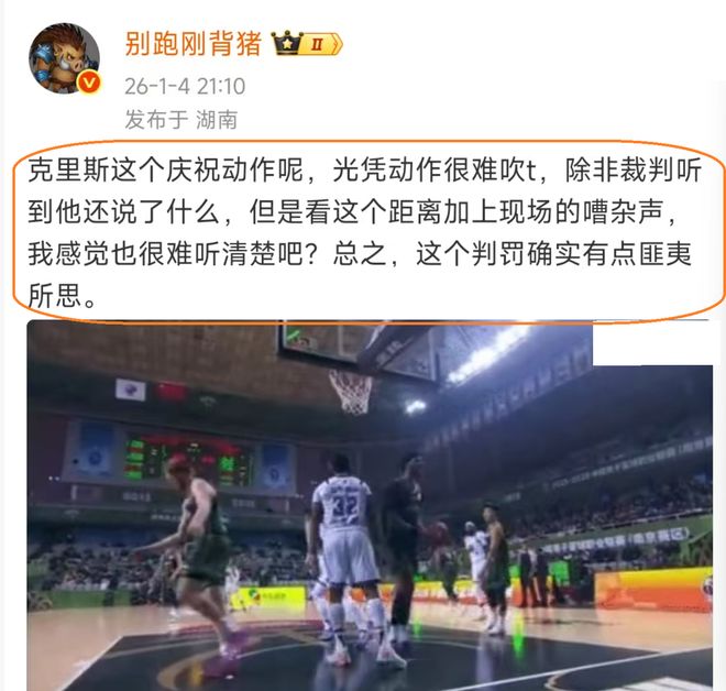 針對此事,CBA籃球記者“別跑剛背豬”,也是進行了點評,他表示從克里斯的動作來看, 很難給他吹一個技術犯規,也許他是說了一些什么,但是現場很吵也很難聽清楚,總之,裁判的這個吹罰,有點匪夷所思。