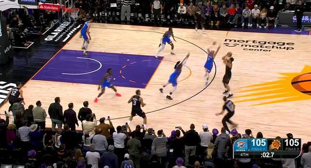 太陽此時場上五個人都有投三分的能力,雷霆沒有輕易選擇包夾,多爾特在布克的突破路線上等待。布克觀察了一下局勢,佯裝左側(cè)突破,隨后撤步三分出手,在多爾特和卡魯索這對讓聯(lián)盟聞風(fēng)喪膽的防守組合面前,投進(jìn)絕殺三分!
