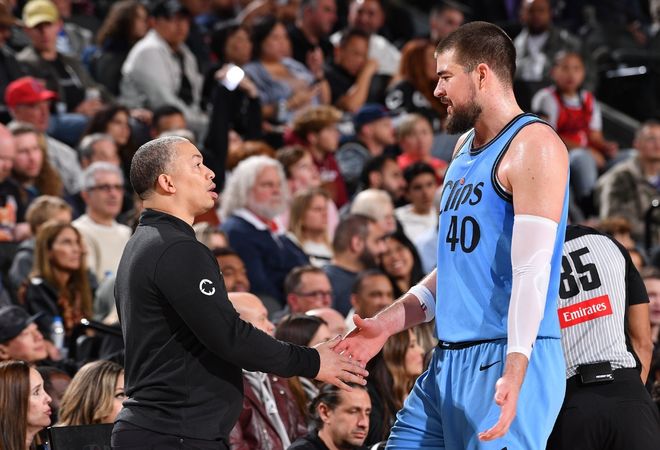 做個對比就明白了,如果是大洛或者巴圖姆來擋拆,對手一定不敢輕易放擋拆人。因為但凡漏一點,他們直接扔三分,不管進不進,機會出來,就證明是一次失敗的防守。但只要是祖巴茨擋拆,對手可以肆無忌憚黏在小卡身上,因為祖巴茨離開籃下,他就沒任何出手能力了!祖巴茨復出后快船慘敗凱爾特人一戰,賽后哈登就有些不滿:為祖巴茨回歸感到開心,但很明顯,你們知道我們需要解決一些事情,他是替補出場的,我們應該打出該有的表現。泰倫盧可以隨便找個理由重用祖巴茨,比如提供護框,提供對位優勢。