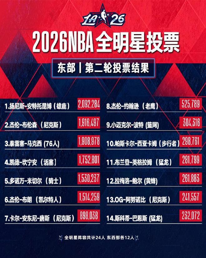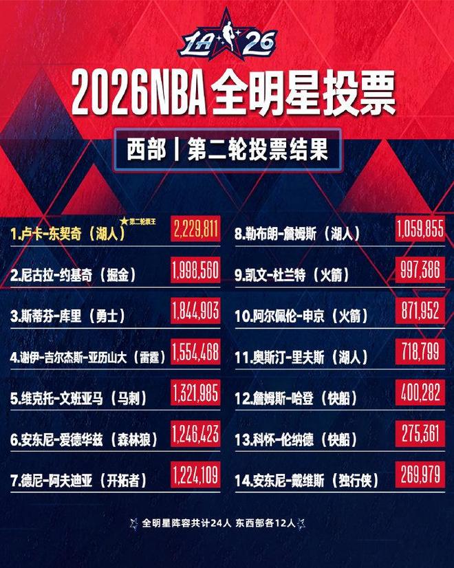 北京時間1月7日,NBA官方公布了2026年NBA全明星第二輪球迷投票結果,洛杉磯湖人后衛盧卡·東契奇與密爾沃基雄鹿前鋒揚尼斯·安特托昆博,分別繼續領跑西部和東部。東契奇為第二輪票王,詹姆斯位居西部第八。