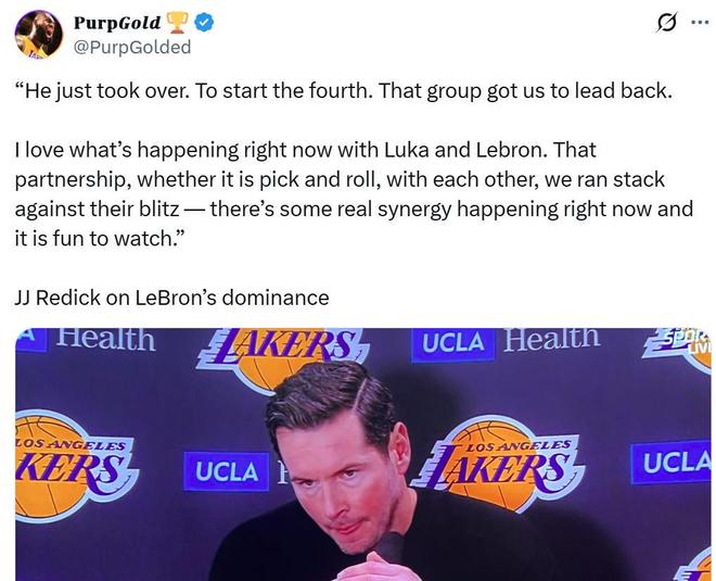 雷迪克賽后稱贊了詹姆斯這樣的表現:“勒布朗接管了比賽,末節一開始他就率隊重奪優勢,我真得太愛東契奇和勒布朗現在的化學反應了,他們之間正產生真正的協同效應,看著真是賞心悅目。”