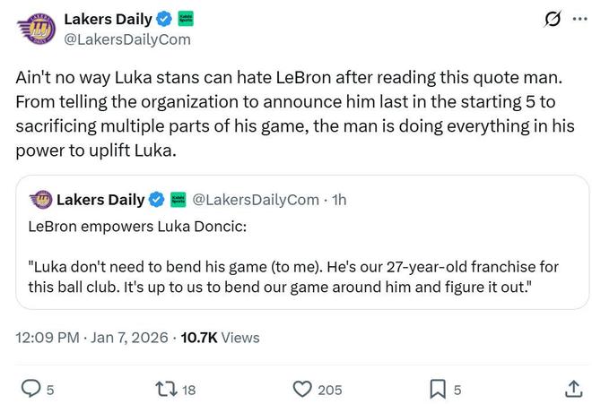 湖人媒體Lakers Daily坦言:“東契奇球迷聽到這一番話后,不可能再討厭詹姆斯了,從球隊介紹首發五虎時將東契奇放在最后,到犧牲各方面適應東契奇,勒布朗竭盡全力來提升盧卡的地位。”