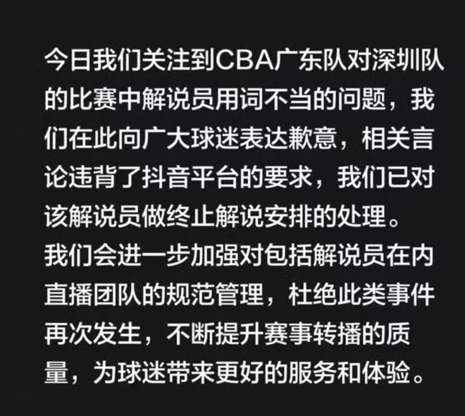 深夜12點!抖音體育公開向廣東隊道歉,解說員用詞不當遭終止解說