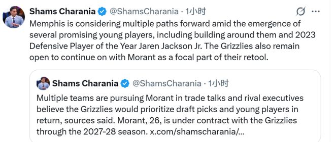 Shams表示,已有多支球隊(duì)對(duì)莫蘭特表達(dá)興趣,灰熊隊(duì)正權(quán)衡未來的建隊(duì)方向:要么留下這位兩屆全明星球員,要么將其交易,圍繞小賈倫-杰克遜和球隊(duì)年輕核心重新打造陣容。他補(bǔ)充道,若灰熊最終達(dá)成涉及莫蘭特的交易,目標(biāo)將是換回年輕球員和選秀權(quán)。
