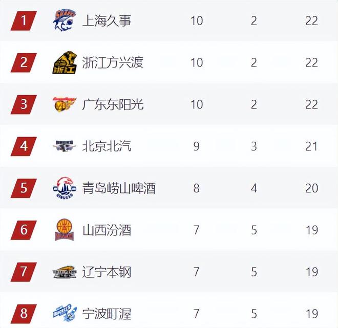 相較于前幾輪北京、廣東、廣廈3隊的輪流登頂,當前積分榜頭名再度迎來易主,本輪北京輸掉了關鍵的京魯大戰,成功將上海送到了榜首位置,上海目前8連勝風頭最盛,廣廈廣東同積22分分列2、3名,北京一夜滑落到第4,好消息是青島近期狀態低迷,2連敗后他們讓出了第4寶座,北京不會跌出前四,壞消息是北京現在想重新回到前三難度不小,未來5輪他們有4場硬仗要打,對手分別是深圳、山西、寧波、上海。