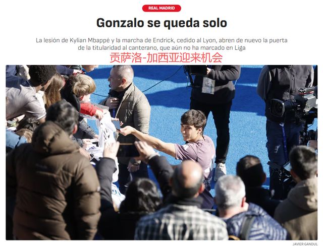 由于左膝外側副韌帶扭傷,姆巴佩將休戰3周。1月3日的《阿斯報》指出,姆巴佩受傷,21歲的貢薩洛-加西亞迎來機會。去年6-7月的世俱杯,貢薩洛-加西亞一鳴驚人,沉寂半年之后,貢薩洛能否抓住機遇?