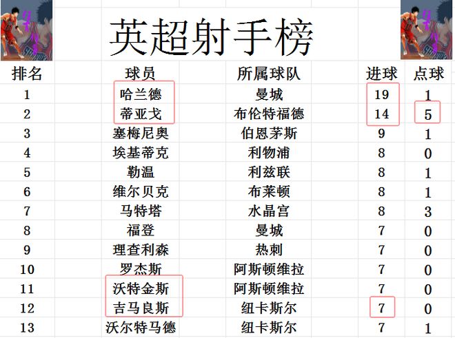 射手榜方面,哈蘭德錯(cuò)失良機(jī)未能進(jìn)球,還是19球領(lǐng)跑。蒂亞戈今天上演帽子戲法,大幅度縮小和哈蘭德差距,5球之差仍排第2。吉馬良斯今天打入一球,追上福登,理查利森,羅杰斯等人7球剛好擠入前十。