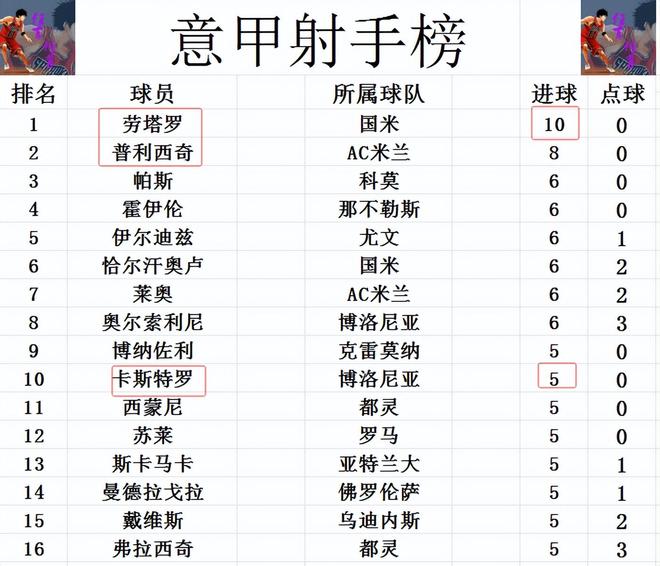 射手榜方面,勞塔羅今天雖然錯失了空門,但還是傳射建功造2球,他也終于是讓意甲本賽季有人進球上雙,10球繼續領跑。普利西奇8球位列第2,霍伊倫,恰爾汗奧盧,萊奧等人6球并列第3。卡斯特羅打入一球后,追上蘇萊,斯卡馬卡等人5球剛好擠入前十。