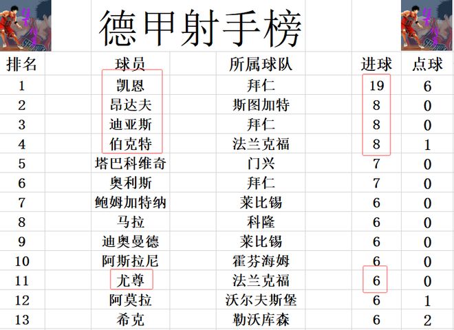 射手榜方面,拜仁同樣是優勢巨大,凱恩19球遙遙領先,比第2的昂達夫,迪亞斯和伯克特等人多了11球之多。尤尊今天打入一球,追上希克,鮑姆加特納等人,6球剛好擠入前十。